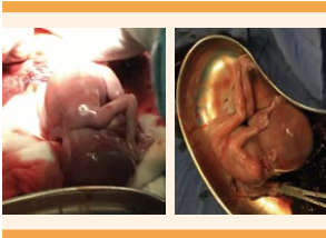 Durante el procedimiento quirúrgico se intentó descartar un luteoma del embarazo roto y choque hipovolémico. La laparotomía exploradora mostró hemoperitoneo de aproximadamente 4000 mL, con múltiples coágulos en la cavidad (Figura 3), que se aspiraron y enseguida se encontró amnios protruyente con feto único, pélvico, de género indefinido, peso de 200 g, talla de 22 cm, Ballard de 20 semanas, sin datos de vitalidad (Figura 4). En el fondo uterino se encontró el cuerno izquierdo roto, con sangrado activo, útero hipertrófico, de bordes irregulares, con pérdida de la continuidad de 5 cm, sangrado activo y anexos sin alteraciones aparentes. Se decidió efectuar la histerectomía subtotal (Figura 5), transfusión de hemoderivados y, posterior al acto quirúrgico, ingresó a la unidad de terapia intermedia.