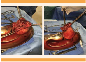 Figura 6. Extracción de la pieza quirúrgica (útero). Se observa solución de continuidad en el fondo uterino, con predominio en el cuerno izquierdo.