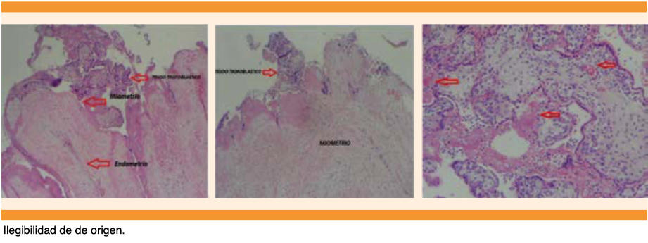 La paciente permaneció en vigilancia en la unidad de cuidados intensivos durante tres días y posteriormente se trasladó al área de hospitalización ginecológica, donde tuvo adecuada evolución y posterior alta hospitalaria con el siguiente diagnóstico: poslaparotomía exploradora e histerectomía abdominal subtotal secundaria a ruptura uterina por embarazo ectópico cornual izquierdo y choque hipovolémico, todos tratados de forma exitosa (Figura 6). Se programó para consulta externa siete días después para el retiro de suturas. El servicio de Patología reportó acretismo placentario. Figura 7