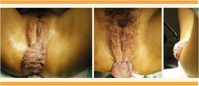 Paciente de 17 años, primigesta, sin antecedentes médicos de relevancia para el padecimiento actual, con serología negativa para VIH. Los síntomas se iniciaron durante el primer trimestre del embarazo (nueve semanas), con la aparición de una lesión verrugosa de 1 cm de diámetro, de bordes irregulares y consistencia sólida. La paciente rechazó el tratamiento en esa ocasión. Cuatro meses después acudió a valoración en el área de Urgencias, con embarazo de 24 semanas, con control prenatal deficiente y datos compatibles con infección del conducto genital inferior, debido a la visualización de un condiloma gigante y anemia, con biometría hemática de 8 mg/dL. La valoración del personal de la clínica de displasia reportó una tumoración de 5 x 5 cm. Se estableció el diagnóstico de tumor de Buschke-Löwenstein y se implementó un tratamiento conservador por petición de la paciente, con fumarato ferroso y medidas higiénicas estrictas, para posterior curación al finalizar el embarazo. Tres meses después ingresó a la unidad médica por prueba sin estrés no satisfactoria, probable restricción del crecimiento intrauterino, además de sangrado de la tumoración, con friabilidad a la exploración y fetidez. Se reportó el crecimiento de la tumoración, de 15 x 9 x 8 cm (Figura 1) y embarazo de 31.6 semanas. El ultrasonido descartó la restricción del crecimiento o daño fetal. Se decidió efectuar la exéresis de la tumoración (Figura 2), con resección en huso mediante electrofulguración y puntos de Wolf hemostáticos, con sutura absorbible, catgut crómico, logrando adecuada hemostasia (Figura 3). El procedimiento quirúrgico transcurrió sin complicaciones, se indicó tratamiento con un antibiótico y útero inhibición profiláctica (25 mg de indometacina por vía oral, cada 12 horas) y se dio de alta del hospital 72 horas después, solo con el antibiótico profiláctico. La paciente continuó en vigilancia médica, en el área de consulta de alto riesgo. El servicio de Patología reportó un condiloma acuminado, hibridación tipo 6. Posteriormente acudió a valoración con embarazo de término (40 semanas); refirió actividad uterina y salida de líquido transvaginal (tapón mucoso), por lo que se realizó la prueba sin estrés, y se encontró variabilidad disminuida (silente) y pérdida del bienestar fetal. Con estos hallazgos se decidió la terminación del embarazo por vía abdominal, sin complicaciones, del que se obtuvo un recién nacido de 38 semanas, de 2930 g, Apgar 8-9. Ambos pacientes se dieron de alta en las siguientes 24 horas. La paciente acudió a seguimiento en la clínica de displasia, donde no ha reportado recidiva, según el estudio macroscópico y la evaluación colposcópica.