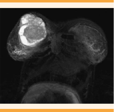 Figura 2 Resonancia tóraco-abdominal (corte coronal), previa al tratamiento neoadyuvante, que evidencia la tumoración de mama derecha.
