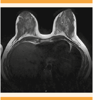 La resonancia magnética evidenció una masa hiperintensa, única, residual, en el cuadrante supero-interno de la mama derecha, de bordes espiculados, que con la administración de gadolinio tuvo realce intenso, con el que se estimó un tamaño de 2.2 x 1.5 x 2.7 cm, (Figura 3) sin reporte de plano graso de separación respecto del músculo pectoral mayor derecho, con discreta infiltración superficial en la misma zona y sin adenopatías axilares de aspecto patológico. Con estos hallazgos se consideró una reacción radiológica parcial, mayor de 50%, después de la quimioterapia neoadyuvante. El estudio genético BRCA resultó negativo.