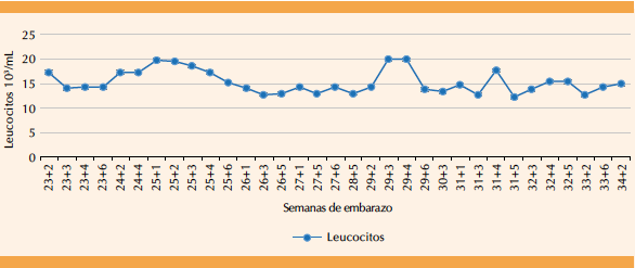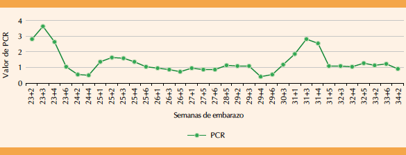 En la semana 31 + 3 del embarazo se elevó la concentración de proteína C reactiva a 2.80 mg/dL, mientras que el resto de los parámetros permanecieron estables (leucocitos 12,900 y neutrófilos 71.5%). La paciente refirió aumento de la leucorrea, por lo que se obtuvo una muestra para cultivo vaginal y se le indicó tratamiento con antibióticos (ampicilina 2 g cada 6 horas y gentamicina 80 mg cada 8 h durante 3 días por vía intravenosa; posteriormente, 500 mg de amoxicilina durante 4 días por vía oral). El reporte del cultivo fue negativo. La concentración de proteína C reactiva volvió a la normalidad en los siguientes días.