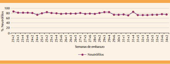 Durante su ingreso se controló la tensión arterial, frecuencia cardiaca y temperatura. Se efectuaron estudios de control cardiotocográfico cada 24 horas, analíticos (hemograma y proteína C reactiva) cada 48 horas y ecográficos de forma seriada. Para reducir el riesgo de infección se evitaron realizar tactos vaginales. Las constantes se mantuvieron estables durante todo el ingreso. Los valores de proteína C reactiva disminuyeron progresivamente después de nacer el primer gemelo hasta llegar a las concentraciones de referencia (Figura 1). Los leucocitos y neutrófilos en sangre permanecieron elevados durante todo el proceso, sin expresar ningún parámetro de infección adicional (Figuras 2y3).