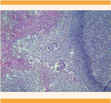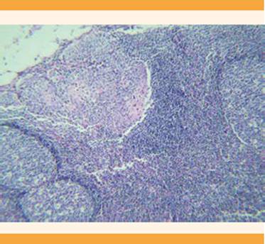Figura 1 Micrometástasis subcapsular de adenocarcinoma seroso de endometrio a ganglio linfático (40x).