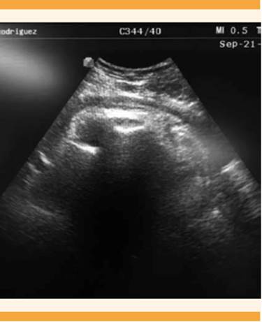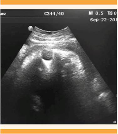 Paciente de 24 años, primigesta, con embarazo de 41 semanas y ruptura prematura de membranas, quien acudió al servicio de urgencias por dolor obstétrico, asociado con contractilidad uterina y salida de líquido transvaginal. A la exploración física se encontraron datos compatibles con el primer periodo de trabajo, con 8 cm de dilatación cervical. La paciente ingresó al área de tococirugía y al completar la dilatación y borramiento cervical permaneció durante 120 minutos en el segundo periodo de trabajo de parto, aún con actividad uterina regular; la altura de la presentación fetal a -1, con caput succedaneum y moldeamiento del polo cefálico. No se distinguió la variedad de la posición en la exploración vaginal. El ultrasonido transabdominal suprapúbico con corte transversal evidenció el signo de estrabismo en el lado izquierdo. Finalizó el embarazo por cesárea, donde se comprobó la anomalía de posición occipito-posterior y el curso de la madre y su hijo transcurrió sin complicaciones.