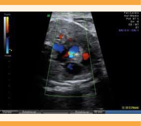 El embarazo actual trascurrió con normalidad, con ecografía del primer trimestre sin anomalías, translucencia nucal de 1.5 mm, y cribado de aneuploidías de bajo riesgo. La ecografía de rutina del segundo trimestre, efectuada a las 21 semanas de embarazo, resultó insatisfactoria por mala visualización cardiaca. La paciente no se presentó al control programado.