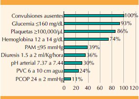 En las pacientes seleccionadas se compararon los valores antes y después del tratamiento intensivo (medición basal y antes de finalizar el embarazo) de acuerdo con nueve metas: 1) presión arterial media ≤95 mmHg; 2) presión venosa central 6-10 cm agua; 3) diuresis 1.5-2 mL/kg peso/hora; 4) glucemia menor de 160 mg/dL; 5) presión coloidosmótica plasmática (PCOP) 24 ± 2 mmHg calculada con la fórmula [(albúmina sérica x 5.54) + (globulinas x 1.43)] x 0.85; 6) pH arterial 7.37-7.44; 7) hemoglobina 10 a 14 g/dL; 8) cuenta plaquetaria ≥100,000 plaquetas/µL y 9) convulsiones ausentes. Se consideró meta alcanzada cuando la medición previa a la finalización del embarazo se encontró en el rango deseado y meta no alcanzada cuando resultó diferente. A su vez, se calculó el porcentaje del logro de cada meta en las pacientes y se consideró como porcentaje “aceptable” cuando el resultado fue ≥ 70% e “inaceptable” cuando la meta en cuestión se cumplió en menos de 70%.