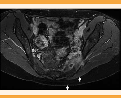 Figura 2 Resonancia magnética pélvica, con supresión grasa sin contraste. Se aprecian engrosamiento y zona hiperintensa sugerente de edema. El músculo piriforme sugerente de edema.