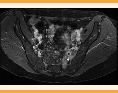 Figura 3 Resonancia magnética pélvica con supresión grasa, con contraste (gadolinio). Se aprecian 2 lesiones anecogénicas con halo hiperintenso a su alrededor sugerentes de abscesos intramusculares.