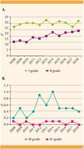 Entre los años 2008 y 2018 se registraron 27,881 atenciones obstétricas. La tasa de episiotomía entre el periodo 1 y el 2 disminuyó de manera muy importante: de 42.3 a 32.8%; [p < 0.001; razón de momios: 0.81 (0.78-0.84)]. (Figura 1A) En cambio, el porcentaje de desgarro aumentó: de 42.7 a 50.8%; (p < 0.001; OR: 1.16[1.13-1.20]). Figura 1B El coeficiente de correlación fue de -0.91. Uno de los factores de riesgo asociados con la episiotomía fue la edad menor de 35 años, con razón de momios de 1.25; IC95%: 1.16-1.35; p < 0.001), pero fue un factor protector de desgarro con razón de momios de 0.76; IC95%: 0.71-0.81; p < 0.001. Si se diferencia entre los diferentes grados (I, II, III y IV) puede observarse que existe un aumento significativo del I y II (Figura 2A), mientras que los de III y IV grado aumentan ligeramente (Figura 2B), aunque sin diferencia estadísticamente significativa. Cuadro 1
