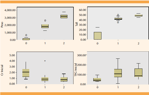Figura 1 Prueba de Kruskal Wallis que muestra las diferencias entre los 3 grupos. Grupo ¨0¨ los embarazos no concluidos o no logrados (aborto, óbito, etc.) 7 casos; Grupo 1 los embarazos pretérmino, 22 casos; y por último en Grupo 2 los embarazos a término, 19 casos. En las 4 imágenes se observan las diferencias gráficas en relación con peso y talla (parte superior izquierda y derecha respectivamente). En la parte inferior la creatinina inicial durante el embarazo y la tasa de filtración glomerular (izquierda y derecha).