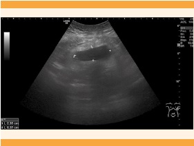 Paciente de 32 años, en curso del tercer embarazo, con antecedentes obstétricos de un aborto y una cesárea, que inició con un cuadro de pseudoclusión intestinal con distensión abdominal y vómitos el decimotercer día poscesárea, después de otorgarse el alta hospitalaria. Reingresó con diagnóstico ecográfico de hematoma extenso en la región vesicouterina y prolongación a la fosa iliaca y el flanco derechos, de 80 x 100 mm. Se le indicaron 900 mg de clindamicina cada 8 h y 240 mg de gentamicina cada 24 h, por vía intravenosa. La hemoglobina fue de 9.2 g/dL (partiendo de 13.2 g/dL en el tercer trimestre del embarazo), por lo que se indicó hierro por vía oral. El drenaje ecoguiado se llevó a cabo el tercer día del ingreso, con buena evolución clínica y radiológica, además de disminución evidente de la colección (Figura 4) hasta desparecer por completo, por lo que al decimotercer día se le retiró el drenaje. El total de volumen drenado fue de 350 cc. Los hemocultivos resultaron negativos. El cultivo del absceso fue positivo para E. faecalis, por lo que se le prescribieron 500 mg de amoxicilina cada 8 h y 300 mg de clindamicina cada 8 h por vía oral. Se dio de alta a su domicilio después de 16 días de su ingreso hospitalario.