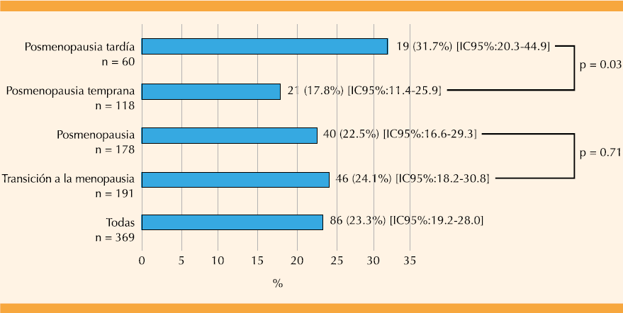 Fue significativamente mayor el síndrome genitourinario de la menopausia en la etapa tardía versus la temprana, 31 vs 17%. En el estudio GENISSE, efectuado en consultorios ginecológicos de España, se encontró 74% en mujeres con más de cinco años de menopausia versus 65% con cinco o menos años.27 Las diferencias entre afrodescendientes y españolas se explican en que las primeras son mujeres que estaban en sus casas y se utilizó una herramienta subjetiva y las otras eran pacientes identificadas con examen e historia clínica.