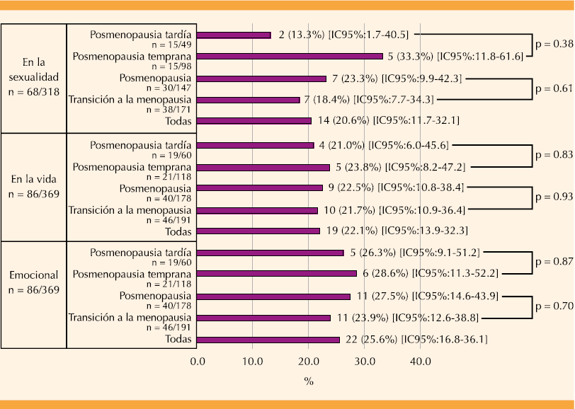 Los síntomas vulvovaginales se relacionan con la función sexual.31-34 En el estudio se encontró que el síndrome genitourinario de la menopausia tuvo repercusiones en la sexualidad en 20.6% de las mujeres, sin variación conforme a los estados menopáusicos. El amplio intervalo de confianza en los estados y etapas menopáusicas puede explicar, al menos en parte, los hallazgos. Es aceptado que la función sexual se deteriora con la edad.31 Así como la disminución de los síntomas se acompaña de incremento en la calidad sexual, la severidad de las manifestaciones implica disfunción sexual e interfiere en la relación de pareja.32 Aspectos socioculturales, como los mitos, preferencias, temores y la masculinidad hegemónica, entre otros, además de los síntomas vulvovaginales, sobre todo la dispareunia, deterioran la función sexual.3,31 Las consideraciones étnico-raciales acentúan las diferencias en la función y satisfacción sexual, con o sin síntomas vulvovaginales.17,35,36 El estudio SWAN reporta que las afroamericanas otorgan mayor importancia al sexo y tienen coitos con más frecuencia que las caucásicas; la importancia que dan a la sexualidad se asocia con la frecuencia de los coitos, el deseo sexual, la masturbación, la excitación, el placer físico, la satisfacción emocional y el funcionamiento sexual.34 Avis y colaboradores33,34anotaron que los años de posmenopausia se asocian con reducción de la función sexual, menor en afroamericanas y mayor en japonesas versus las caucásicas.