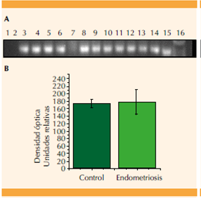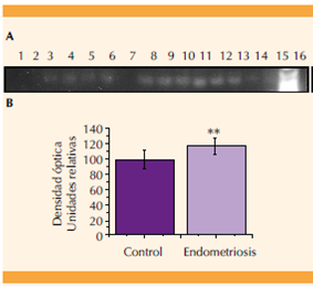 Se muestra la expresión diferencial entre el grupo de pacientes sanas (control), y con endometriosis (A). La imagen es representativa y se muestra el control negativo (carril 1), muestras de pacientes del grupo control (carriles 2 9), y la expresión de las pacientes con endometriosis (carriles 10-14), control positivo de carga (carril 15), y marcador de peso molecular (carril 16). La gráfica muestra la densidad óptica (unidades relativas) de las bandas de expresión (B). Se indica la diferencia estadísticamente significativa