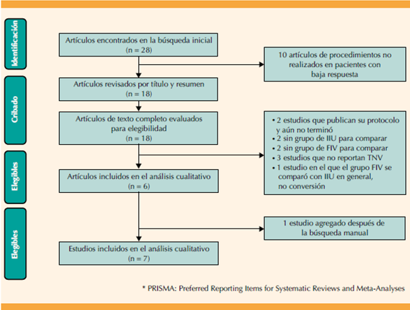 La búsqueda bibliográfica recuperó 28 citas, de las que 18 fueron elegibles para consideración después de la selección de títulos y resúmenes. De estos, 6 estudios cumplieron los criterios de inclusión de la revisión sistemática, publicados entre 2009 y 2014.23-28 La verificación de referencias cruzadas resultó en una inclusión adicional de un artículo: Elzeiny y su grupo29 no se identificó en la búsqueda porque el título refiere que se llevó a cabo en pacientes con infertilidad idiopática o factor masculino leve; sin embargo, al revisar el artículo, solo se incluyeron pacientes con respuesta a la estimulación ovárica convencional de 2 o 3 folículos, que justo es la definición de baja respuesta ovárica, 4 por eso se incluyó en la revisión sistemática (Figura 1). Se analizaron en total 3398 pacientes (fertilización in vitro 2115; inseminación intrauterina: 1283).
