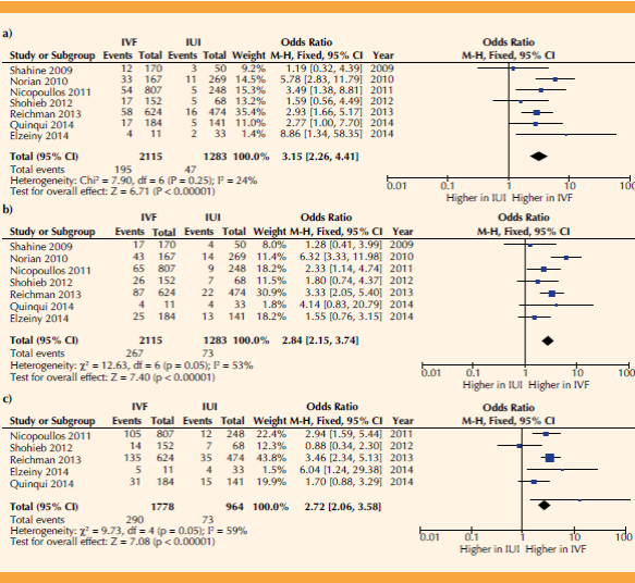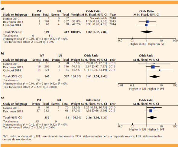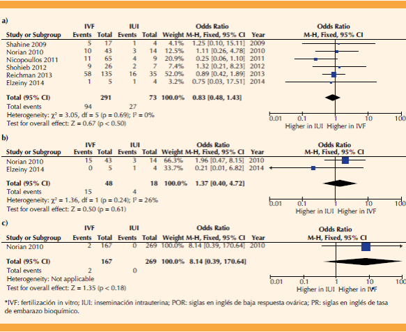 Figura 2 Gráfica tipo forest plot de la comparación de continuar con fertilización in vitro vs convertir a inseminación intrauterina en pacientes con baja respuesta ovárica. Análisis: a) Tasa de nacido vivo; b) Tasa de embarazo clínico; c) Tasa de embarazo bioquímico. Figura del autor.