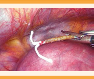 Se efectuó una valoración global en la consulta, con exploración física general y ginecológica. Su estado general era bueno y los genitales externos eran normales. En la especuloscopia, el cuello uterino no tenía alteraciones macroscópicas y no se visualizaban los hilos del DIU. La exploración se complementó con una ecografía transvaginal y una resonancia magnética, en la que se advirtió el útero gestante, con un embrión vivo en su interior acorde con las 12 semanas. El anejo derecho era de ecoestructura y tamaño normal, evidenciando el vástago del DIU enclavado en la trompa derecha (Figuras 1y2). Ante la complejidad del caso, se discutió en una sesión clínica, aportando las últimas actualizaciones de la Organización Mundial de la Salud (OMS) sobre el tema y, por último, se consensuó su retiro mediante cirugía laparoscópica. Así, pues, se efectuó la laparoscopia exploradora a las 16 semanas de gestación, extremando las precauciones durante la misma, en la posición mínima de Trendelenburg a 12 grados. Se decidió acceder con una entrada laparoscópica abierta, siguiendo la técnica de Hasson. Se realizó una incisión con bisturí en el ombligo, posteriormente se fue avanzando bajo visión directa por la aponeurosis y el peritoneo hasta entrar en la cavidad. Se utilizó una presión intraabdominal de 8 mmHg, una óptica de 0o y energía de ultrasonido para cortar y coagular; se evitaron la energía monopolar y bipolar. El procedimiento se llevó a cabo mediante tres puertos laparoscópicos, a la altura del ombligo, donde se introdujo el trócar óptico de 11 mm y, en la fosa iliaca izquierda y derecha, con trócares accesorios de 5 mm. Durante la cirugía se confirmó la existencia del DIU enclavado en el ligamento útero-ovárico derecho (Figura 3), que se extrajo sin complicaciones. Después del procedimiento se realizó una ecografía abdominal para confirmar la viabilidad fetal. La evolución posoperatoria fue excelente, con alta a su domicilio a las 24 horas de la intervención. A la hora del envío a publicación del reporte, la paciente cursaba la semana 30 y el embarazo trascurría con normalidad.