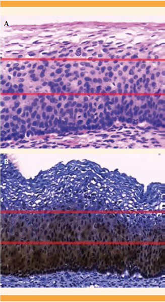 Figura 1 Cortes histológicos de biopsia de cuello uterino con LIE-AG-NIC2. La lesión afecta los dos tercios inferiores (líneas rojas) del epitelio escamoso teñido con hematoxilina eosina (A), con tinción positiva para p16 en la misma localización (B). A: hematoxilina eosina, 40X; B: inmunohistoquímica p16, 40X.