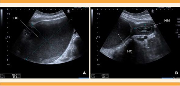 Figura 1 Ecografía transabdominal, corte sagital. A. Hematocolpos (HC). B. Hematocolpos (HC) y hematometra (HM).