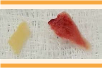 Figura 4 Hallazgos macroscópicos de metaplasia ósea de endometrio. Fragmentos de tejido, color blanco amarillento y de aspecto hemorrágico, ambos irregularmente aplanados, de consistencia dura y apariencia ósea.