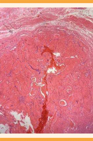 Ingresó al servicio de Urgencias debido a un cuadro de dolor abdominal cólico, de 72 horas de evolución, con tratamiento antibiótico para contrarrestar la infección de vías urinarias, sin mejoría. Por esto acudió al hospital, donde fue valorada por los médicos del servicio de Cirugía general por síndrome doloroso abdominal modificado por el tratamiento farmacológico. A la exploración física se encontraba con el abdomen blando, peristalsis disminuida, punto de Mc Burney doloroso, signos del obturador y von Blumberg positivos. El resto de la exploración trascurrió sin alteraciones. Leucocitosis de 13.6 x 103 /L, neutrofilia 81.2%, bandemia 2%, con una prueba inmunológica de embarazo negativa. Ante la sospecha de apendicitis aguda se decidió la intervención quirúrgica de urgencia. En la laparotomía exploradora se encontraron: torsión mayor de 360° de la salpinge derecha (Figura 1), aumentada de volumen (6 cm de diámetro), con datos de isquemia (Figura 2), líquido de reacción inflamatoria libre en la cavidad con volumen de 5 0cc, apéndice cecal sano. Se efectuó la detorsión pero no se recuperó la viabilidad, por lo que se procedió a la salpingectomía derecha. El reporte histopatológico fue de pieza quística de 6 x 4.5 x 4cm, de color marrón-violáceo, de consistencia renitente (Figura 3). Al corte se encontró una lesión quística unilocular de 3.5 x 4cm, con material hemático violáceo, de consistencia blanda. Reporte: hematosalpinx con lesión compatible con torsión tubárica caracterizada por abundante tejido hemático, necrosis y adelgazamiento de la pared. Figura 4