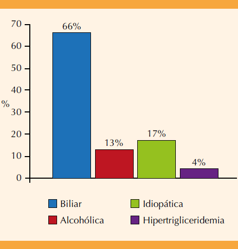 La principal causa de la pancreatitis durante el embarazo es de origen biliar (66%), aunque existen otras que pueden condicionar su origen.4 Figura 1