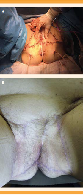 Figura 3 A. Posoperatorio inmediato al cierre del defecto, con colgajos de avance V-Y. B. Apariencia a los seis meses de la intervención, sin signos de recidiva.