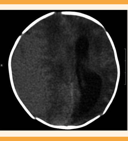 Figura 4 Tomografía axial computada de cráneo del recién nacido: desplazamiento de la cisura interhemisférica. Hematoma subdural derecho. Ventriculomegalia contralateral.