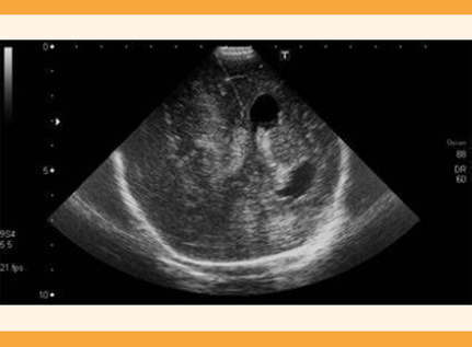 Figura 5 Ecografía portátil del recién nacido. Hematoma subdural derecho de 2.4 x 7.8 cm con marcado efecto de masa, con colapso ventricular ipsilateral y dilatación del ventrículo lateral contralateral (izquierdo). Desviación de la línea media hacia la izquierda 1.2 cm.