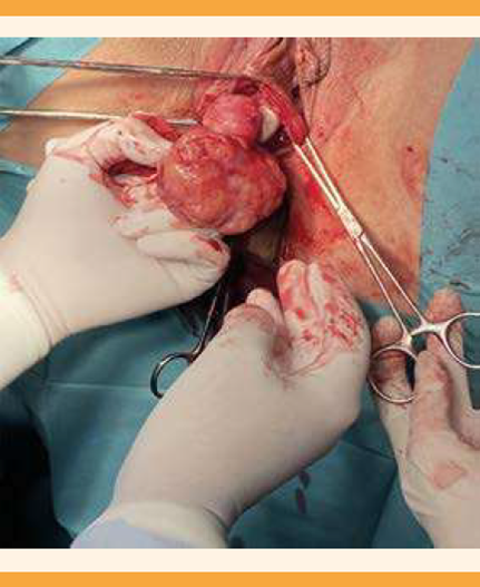 Durante el intraoperatorio se confirmó la existencia de una tumoración de aspecto sólido y grande, de aproximadamente de 7 cm (Figura 1). Para extirparla se hizo una incisión elipsoide en el seno del quiste (Figura 2) y posterior apertura mediante una incisión longitudinal sobre el mismo. En lugar de evidenciar material mucoide se apreció una tumoración sólida y bilobulada de 7 cm, con crecimiento hacia el ano y en profundidad que se introducía en el canal vaginal, desplazando y sin invadir las estructuras vecinas (Figura 3). Se procedió a extirpar la lesión mediante enucleación y se remitió el material con carácter preferente para el estudio anatomopatológico. Figura 4