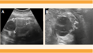 Figura 2 (A) Corte ecográfico coronal y (B) transversal de la región toracoabdominal fetal tomado a las 33 semanas donde se observa una imagen heterogénea, avascular, septada, de bordes regulares que corresponden a un hamartoma mesenquimal hepático (flechas) confirmada meses después del nacimiento por estudio histopatológico.
