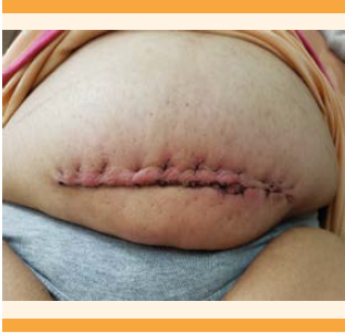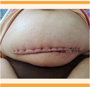 El tipo de incisión efectuada en la paciente del caso demostró que es la de menos complicaciones. La incisión transversal, a cierta distancia de la zona suprasinfisaria clásica, tiene ventajas para la paciente. Esta incisión debe hacerse algunos centímetros debajo de la línea que une las dos espinas ilíacas anterosuperiores; de esta manera, el obstetra tendrá acceso directo al segmento inferior del útero. Además, el grosor del panículo graso a menudo se reduce en este territorio en comparación con la región suprasinfisaria, lo que facilita el cuidado de la cicatriz y ésta no aparece demasiado alta cuando la paciente está de pie.19,20