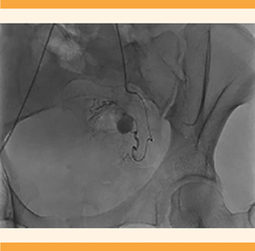 A su llegada al hospital de tercer nivel, la paciente se encontró estable y con sangrado en menor cantidad, pero persistente. Fue valorada por el radiólogo. Ante la sospecha de una malformación vascular se decidió proceder a la arteriografía pélvica en la que se objetivó una formación sacular, dependiente de la arteria hipogástrica izquierda, compatible con un pseudoaneurisma (Figuras 3 y 4) que justificaba la clínica de la paciente. Por ello, se decidió practicarle un cateterismo con embolización selectiva de la rama aferente del pseudoaneurisma, que concluyó sin contratiempos y se comprobó la ausencia de flujo a la formación aneurismática posterior a la embolización. Figura 5