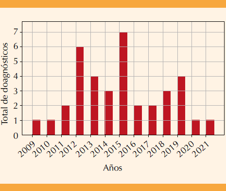 En el periodo estudiado se observó que el año con mayor incidencia de tumor filodes fue el de 2015 con 7 casos, seguido por 2012 con 6 casos y 2019 con 4 casos. Es importante resaltar que en 2020 hubo una disminución de casos debido al posible efecto de la pandemia de COVID-19. Figura 2