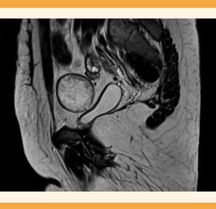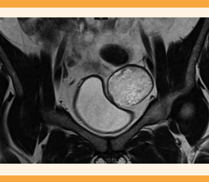 Figura 2 Lesión adyacente a la región superior del ovario izquierdo, de bordes bien definidos con aparente cápsula hipointensa en t1, hipertensa en t2 de 40 x 38 x 48 mm, sin evidente grasa ni artefacto de calcificación.