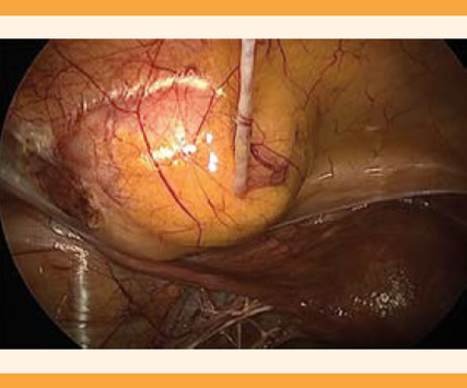 Figura 4 En la laparoscopia operatoria los ovarios se evidenciaron normales, con ausencia del mesosalpinx en la trompa izquierda, una masa de 5 cm localizada en el retroperitoneo, en el espacio prevesical, lateral al ligamento umbilical izquierdo.