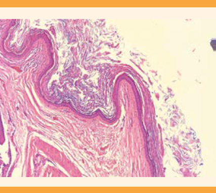 Las características macroscópicas del teratoma quístico benigno son: masa multiquística con secreción sebácea amarillenta o marrón, pegajosa y densa y, en ocasiones, de mal olor.2-11 Son tumores con más de un tipo de células, correspondientes a las capas de células germinales4-12 del ectodermo (piel, pelo, cerebro, epitelio escamoso), mesodermo (grasa, hueso, cartílago, dientes, músculo) y endodermo (epitelio respiratorio, intestinal glandular). Por lo general, el tipo de tejido predominante es el de origen ectodérmico.8-11