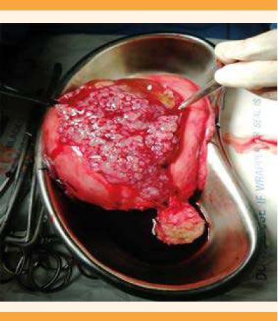 Paciente de 43 años, menarquia a los 13 años, ritmo regular 30 x 8 eumenorreicos. Inicio de la vida sexual activa a los 18 años, sin ningún método de planificación familiar. Antecedentes ginecoobstétricos: 6 embarazos y 5 partos. Acudió a consulta debido a la caída de su plano de sustentación 3 días antes, con dolor pélvico en el hipogastrio, tipo cólico de intensidad moderada, sin sangrado transvaginal. Refirió estar embarazada, sin recordar la fecha de la última menstruación; sin control prenatal ni ultrasonido previo. A la exploración física el abdomen se palpó blando, depresible y globoso a expensas de útero hipertrófico de 16 x 12 x 10 cm, sin datos de irritación peritoneal. Al tacto vaginal el cuello del útero se encontró: grueso, largo posterior y sin sangrado transvaginal. Los estudios de laboratorio reportaron: biometría hemática normal; PFH normales; QS normal; VDRL negativo; hormona gonadotrofina coriónica fracción beta (GCH-ß) mayor de 150,000 mUI/mL. EGO negativo y perfil tiroideo normal. El ultrasonido de hígado y vías biliares sin alteraciones. El ultrasonido endovaginal y pélvico reportó: útero en anteversoflexión, central, aumentado de tamaño por imagen ecográfica en copos de nieve (Figura 1); ambos ovarios normales. Los datos previos orientaban a un caso de mola hidatiforme. La paciente se hospitalizó para histerectomía abdominal total. En ese procedimiento se encontraron: útero aumentado de tamaño a expensas de mola completa y los anexos sin alteraciones. Figuras 2 y 3