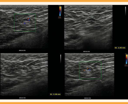 La ecografía de la mama debe incluir la zona axilar. Se considera la primera elección de estudio de imagen porque no implica la exposición a la radiación ionizante y permite la identificación de lesiones benignas, mientras puede tomarse la biopsia de las lesiones sospechosas.10