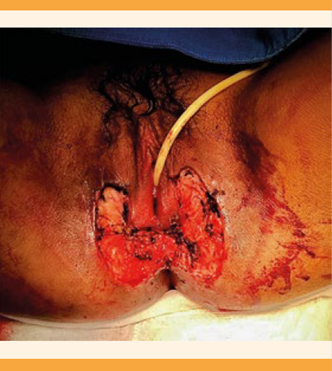 Paciente primigesta de 14 años, con embarazo de 21 semanas, que acudió al servicio de Urgencias de Ginecología del Hospital Juárez de México por una masa dolorosa en la región perineal. Refirió que cinco meses previos a la consulta tuvo una lesión redondeada, no dolorosa, de aproximadamente 1 x 1 cm en la región perineal. Acudió con un médico particular, quien le indicó antibióticos (no especificados), sin reacción satisfactoria. La tumoración aumentó de tamaño hasta impedir la sedestación y parcialmente la deambulación. A la exploración física se encontraron, en la región perineal, dos lesiones exofíticas, coliformes, irregulares y ulceradas, de aproximadamente 20 x 10 cm, con secreción amarillenta fétida, sugerentes de tumor de Buschke-Löwenstein (Figura 1). El ultrasonido obstétrico no mostró alteraciones; los estudios paraclínicos, que incluyeron panel viral, resultaron negativos, y el exudado vaginal reportó Mycoplasma hominis y Ureaplasma parvum, por lo que se administró tratamiento. Se decidió realizar resección con cierre de la herida mediante bloqueo peridural; la escisión fue total y no requirió reconstrucción (Figuras 2 y 3); no obstante, cinco días después se llevó a cabo el lavado de la herida quirúrgica por dehiscencia y se practicó el cierre por segunda intención. Se colocaron parches de hidrogel para inducir la granulación del tejido, con cambio de material cada cinco días (Figura 4). El estudio de patología evidenció un condiloma acuminado gigante sin lesión en el borde quirúrgico. La prueba de PCR detectó el genotipo 53 del virus de papiloma humano. La paciente refirió haber recibido dos dosis de la vacuna contra VPH a los 12 años de edad, en la escuela secundaria, y negó comorbilidades asociadas. Después de doce semanas se observó re-epitelización completa de la herida. Figura 5