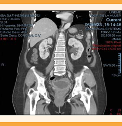 Paciente de 68 años, con antecedentes de cinco embarazos, tres partos y dos cesáreas, con vida sexual activa, diabetes mellitus tipo 2 e hipertensión arterial crónica, en control. Acudió a consulta debido a un dolor de gran intensidad en la fosa iliaca izquierda, con irradiación a la fosa iliaca derecha, acompañado de vómitos; esto disminuyó la toma pautada de antiinflamatorios no esteroideos y de los antibióticos. Lo anterior condujo a tres hospitalizaciones previas, sin mejoría del cuadro. A su ingreso al hospital llegó con dolor intenso en ambas fosas iliacas y con evacuaciones diarreicas.