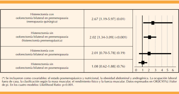 | Menopausia quirúrgica (Histerectomía con ooforectomía bilateral en la premenopausia) | 2,86 [1,08-7,57] (<0,05) | 3,58 [1,61-7,95] (0,001) | 1,18 [0,56-2,50] (0,65) | 2,35 [1,11-4,95] (<0,05) | 1,90 [0.91-3,97] (0,08) | 1,63 [0,76-3,49] (0,20) | 3,09 [1,47-6,48] (0,001) | 3,29 [1,57-6,89] (0,001) | 5,26 [2,49-11,08] (<0,001) | 1,06 [0,13-8,19] (0,94) | 2,89 [1,33-6,27] (<0,001) |
