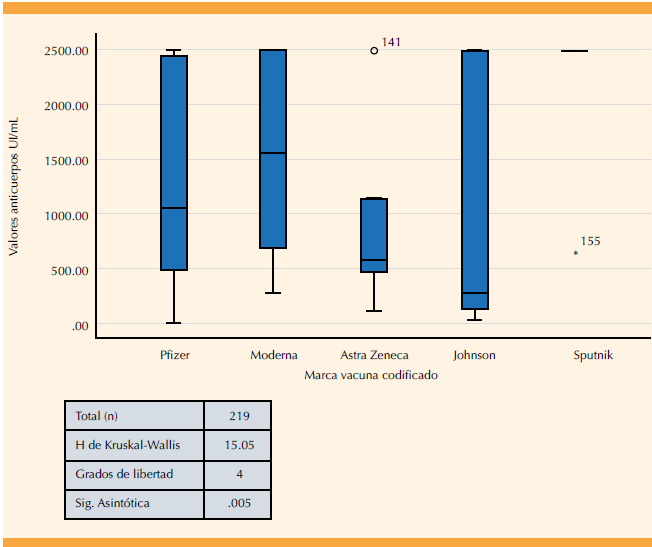 De acuerdo con la prueba no paramétrica de Kruskal-Wallis, se observaron diferencias estadísticamente significativas entre la concentración de anticuerpos y tipo de vacuna administrada, con una mediana y distribución mayor entre la vacunación con Moderna® y Sputnik® límites promedio 123.18 y 176.25; p = .005 comparadas con las otras vacunas. Figura 1
