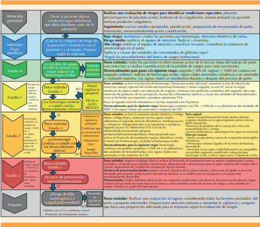 Las guías de hemorragia posparto establecen un plan de urgencia por etapas que engloba las acciones más relevantes a practicar. Una de ellas, el Proyecto de Colaboración para la Atención Materna de Calidad de California (CMQCC)25 marca el protocolo general de atención para la hemorragia obstétrica. Figura 1