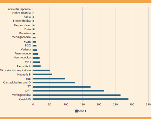 Los médicos enlistaron 23 diferentes aplicaciones, las 5 más referidas fueron: 1) COVID-19 (88.1%); 2) influenza estacional (81%); 3) DPT (65.8%); 4) toxoide tetánico (53.3%) y gama-globulina anti-D (38.7%). Cuadro 2