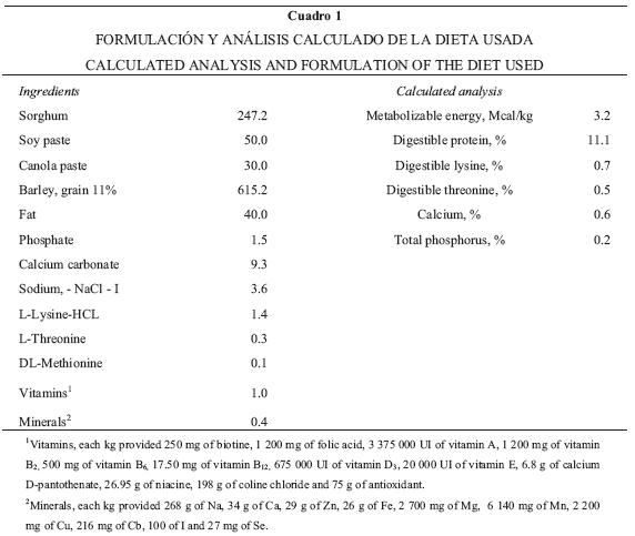 Los cerdos permanecieron 21 días en el experimento y se sometieron a dos periodos de recolección de heces y orina. El primer muestreo se realizó los días2 al 5, y el segundo los días 18 al 21. Los animales se alojaron en jaulas metabólicas provistas de un comedero removible, que se usó para ofrecer el alimento y el agua entre comidas. Cada jaula tenía una malla y una charola que permitieron recolectar las heces y separar la orina. El espacio disponible de piso por jaula fue de 0.81 m2, excluyendo el espacio ocupado por el comedero. El alimento se formuló para cubrir o exceder el requerimiento de nutrimentos de cerdos en finalización14 (Cuadro 1), y se suministró en dos comidas con duración de 30 min cada una, a las 8 y 16 h, respectivamente.