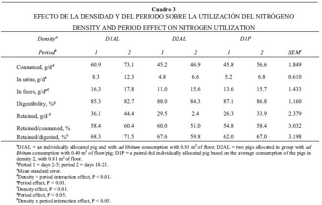 Los resultados de la utilización de nitrógeno se muestran en el Cuadro 3. En el consumo de nitrógeno y el nitrógeno retenido en gramos la interacción densidad x periodo resultó significativa (P < 0.01) debido a que en el periodo 1 fueron mayores en D1AL, comparados con D2AL y D1P, entre ambos no hubo diferencias estadísticas; en el periodo 2, estas dos variables fueron diferentes entre densidades: mayores en D1AL, intermedias en D1P y menores en D2AL. En el porcentaje de nitrógeno retenido sobre el nitrógeno digerido la interacción densidad por periodo resultó significativa (P < 0.05), ya que en el periodo 1 no fue diferente estadísticamente entre densidades; mientras que en el periodo 2 fue mayor en D1AL, comparado con D2AL y D1P, y entre estas últimas densidades no se observaron diferencias significativas. La excreción de nitrógeno en heces fue mayor en D1AL y similar estadísticamente entre D2AL y D1P (9.8, 6.6 y 5.6 g/d, EEM = 0.42; P < 0.01). Con respecto al periodo, la excreción de nitrógeno en orina fue menor en el periodo 1 que en el periodo 2 (13.7 y 16.4 g/d, EEM = 0.81; P < 0.01). La excreción de nitrógeno en heces fue menor en el periodo 1 que en el 2 (6.1 y 8.5 g/d, EEM = 0.35; P < 0.01). La digestibilidad de nitrógeno fue mayor en el periodo 1 que en el 2 (86.4% y 84.2%, EEM = 0.66; P < 0.05).