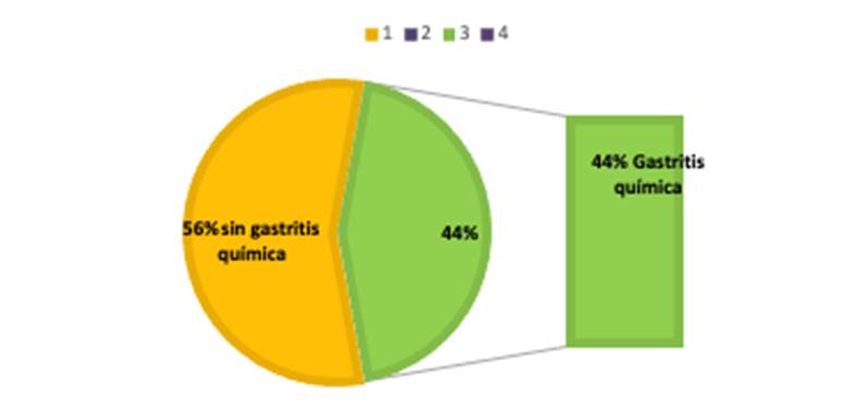 En el grupo evaluado de los 458 pacientes con reflujo duodenogástrico, el 44.1% (202 casos) presentaron gastritis química o biliar por reporte histopatológico (GQ), y el 55.9% (256 casos) no resultaron con esta condición (Figura 1).